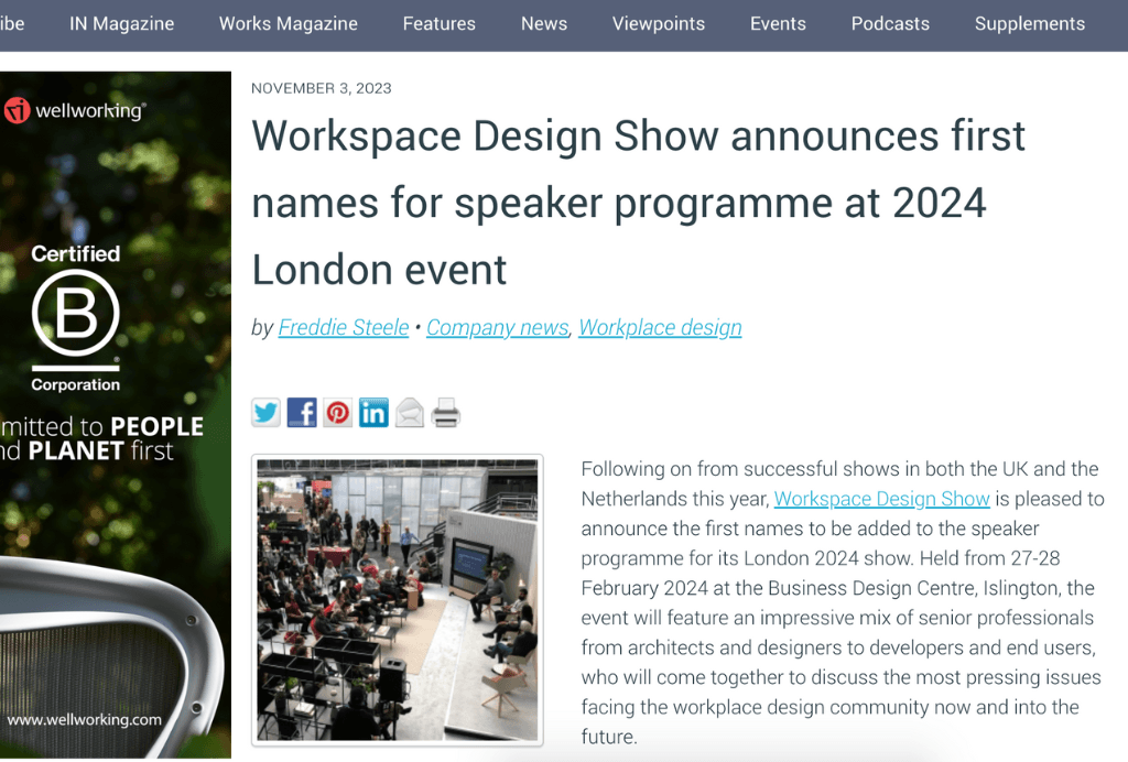 Our friends over at Workplace Insight recently published an article detailing the Workspace Design Show UK's 2023 speaker line-up.